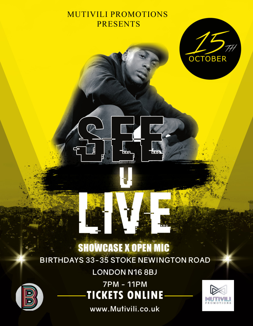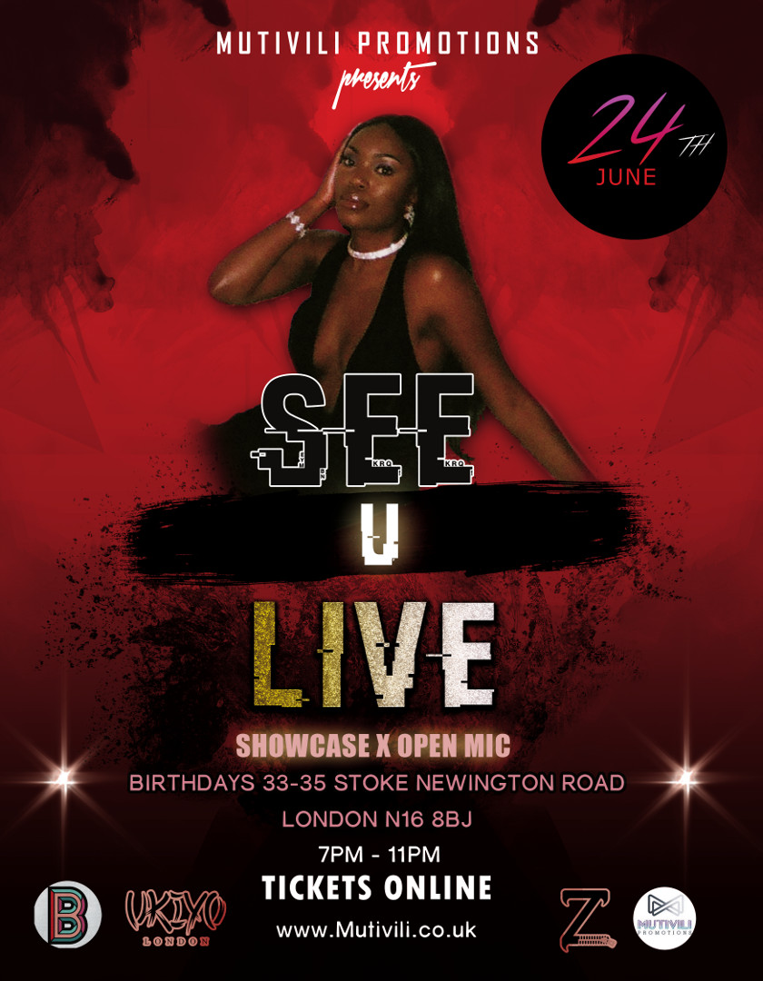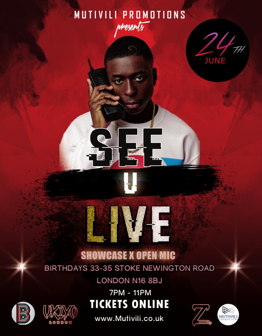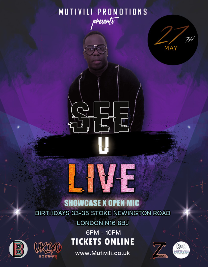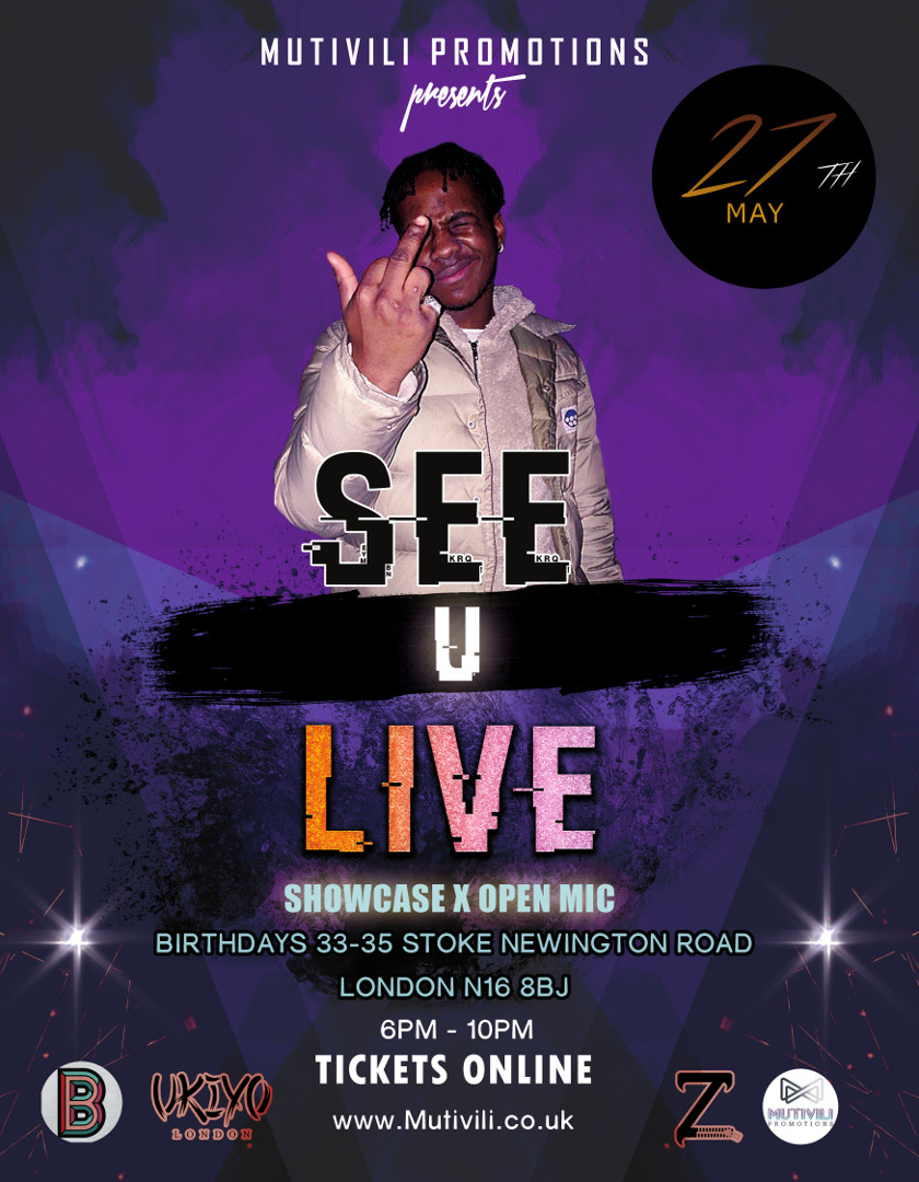 SEE U LIVE SHOWCASE IS BACK!!! We return to Birthdays Dalston this October with another superpowered lineup. Performances by: Juelz Dirty Daps Patrin Tee the Singer Justo Kenzo Dthrills ...