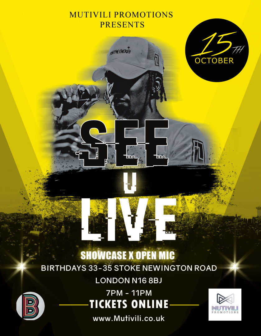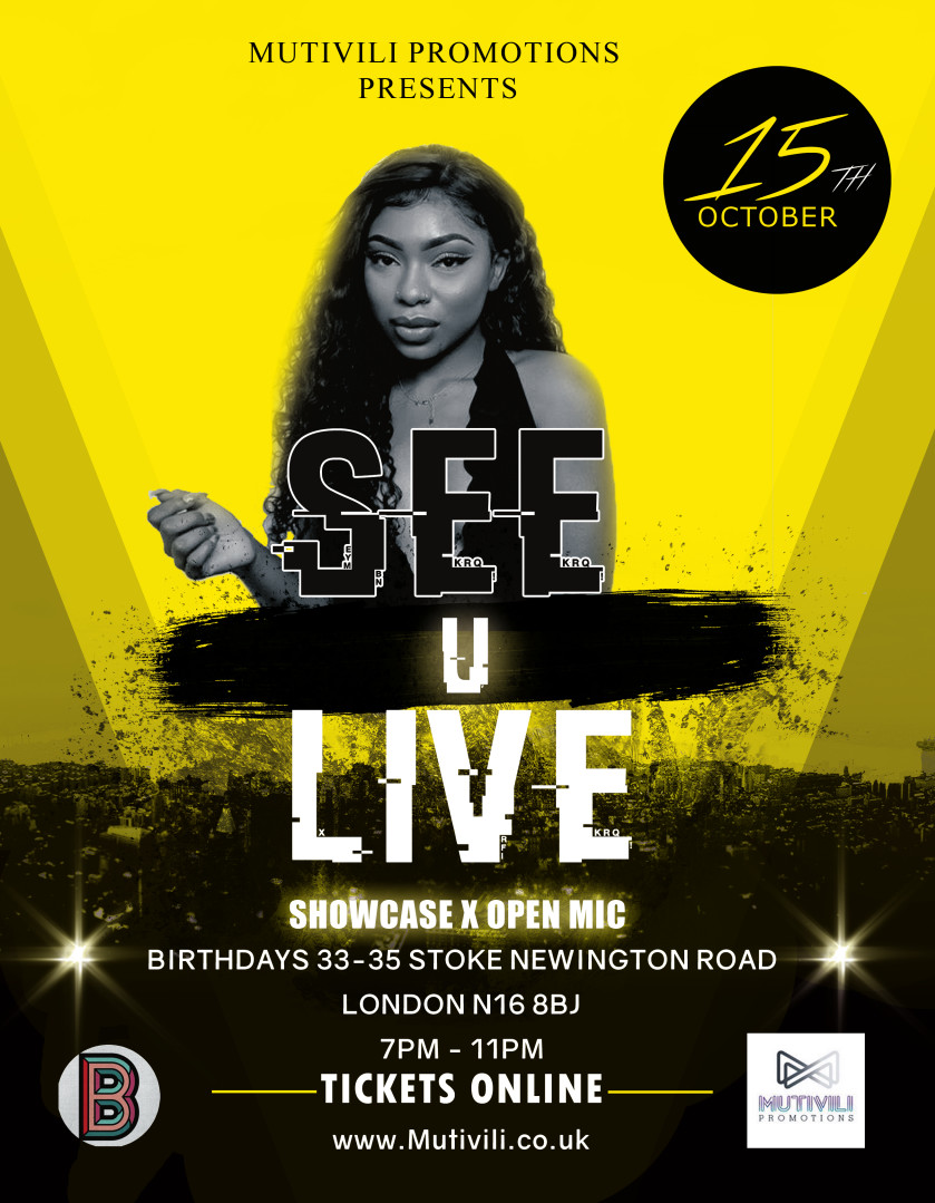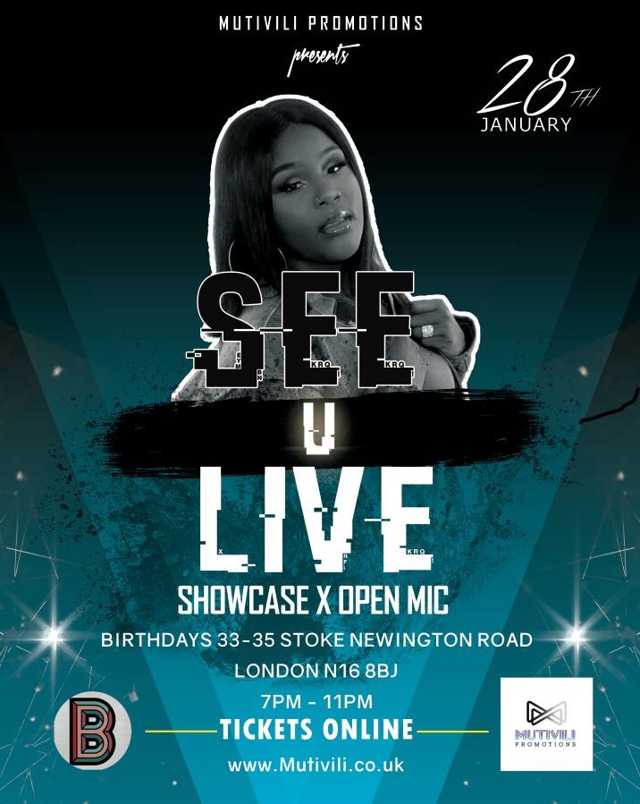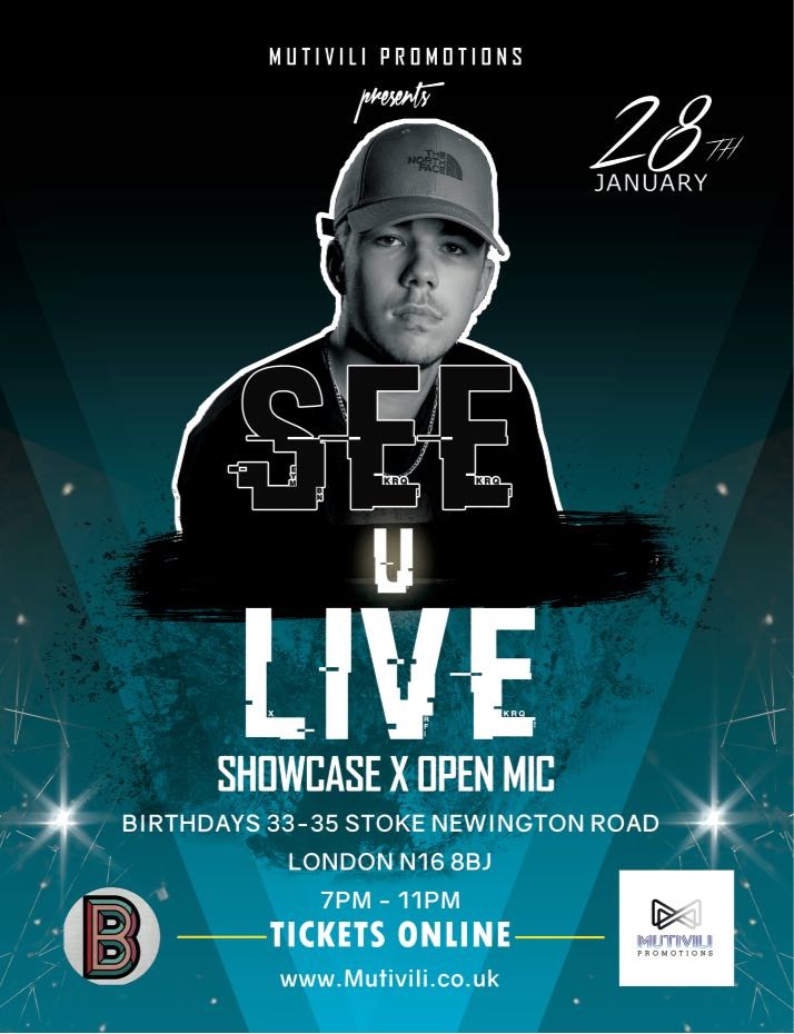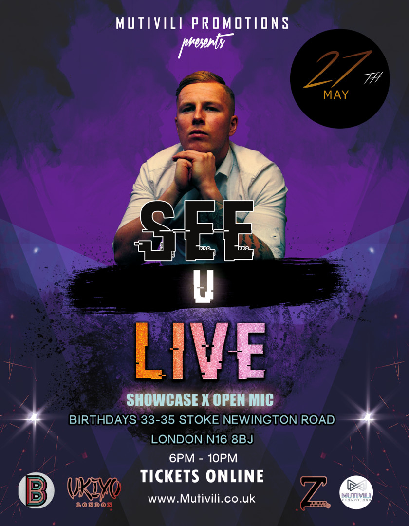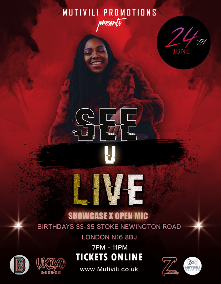 SEE U LIVE SHOWCASE IS BACK!!! We return to Birthdays Dalston this October with another superpowered lineup. Performances by: Juelz Dirty Daps Patrin Tee the Singer Justo Kenzo Dthrills ...