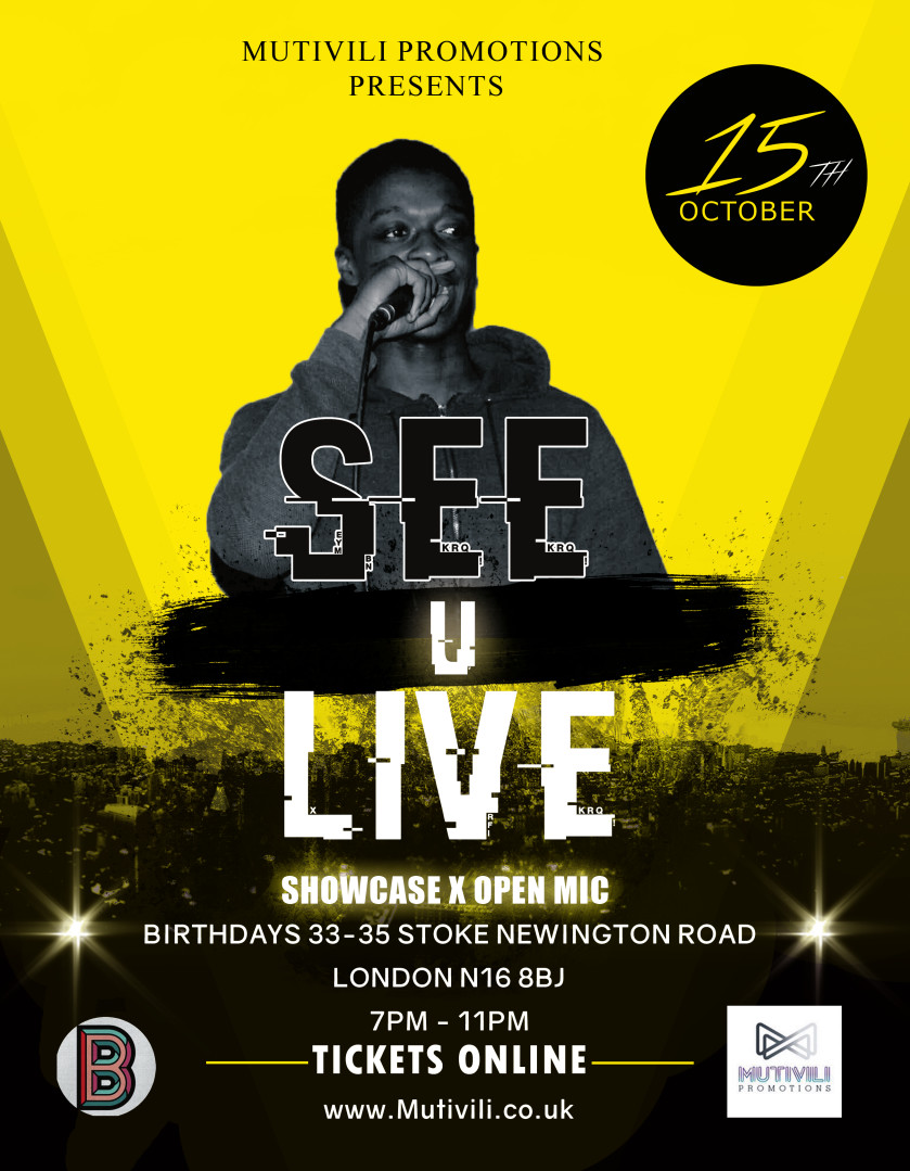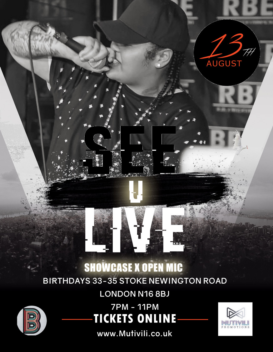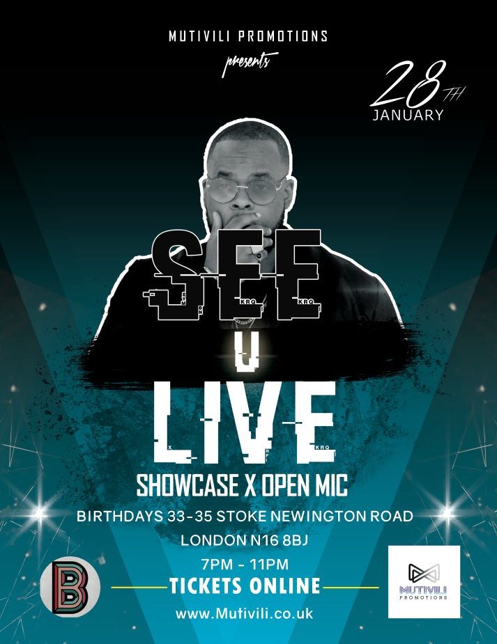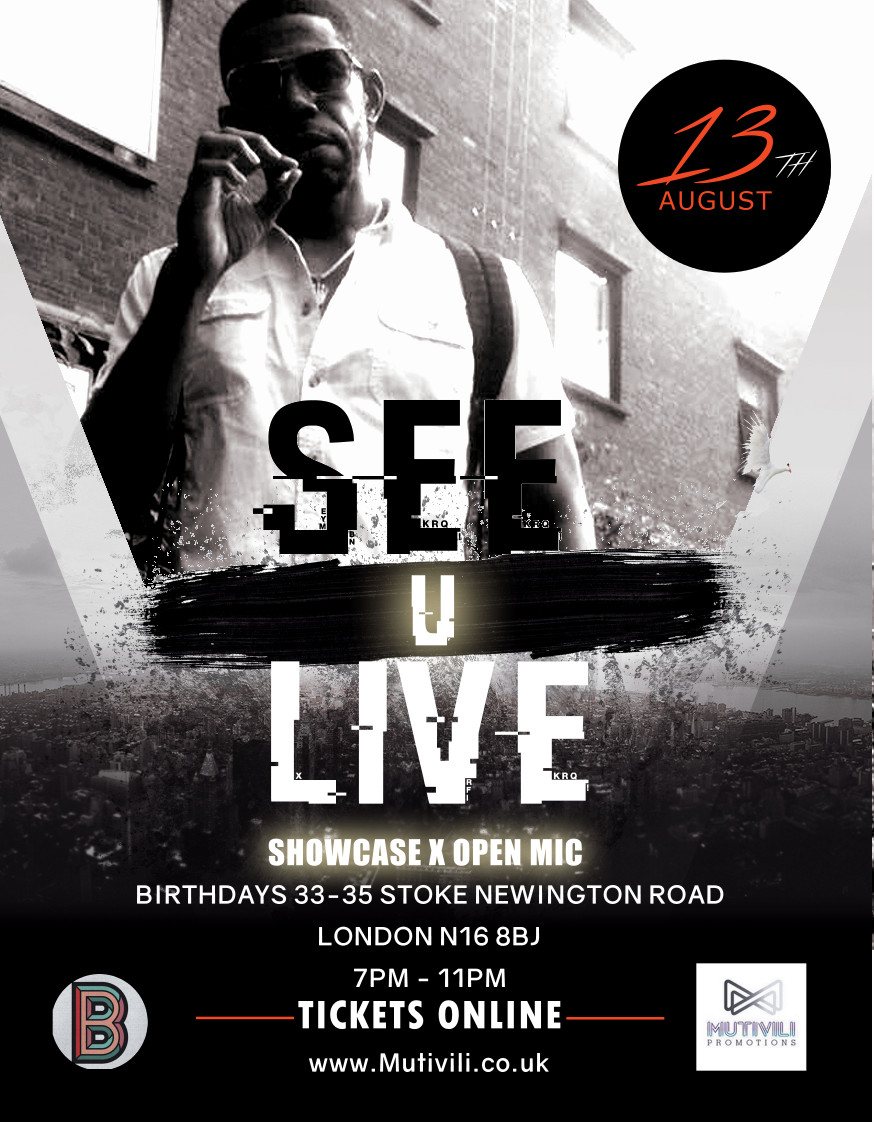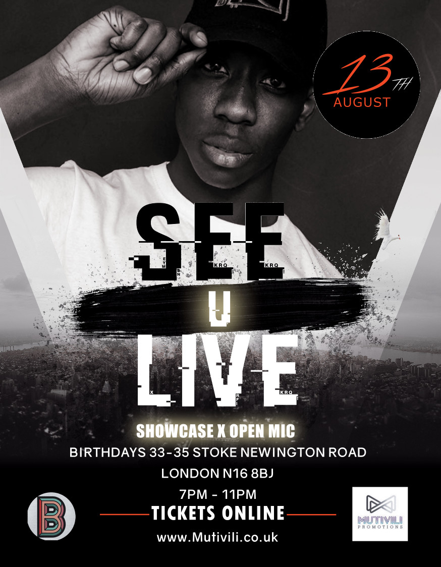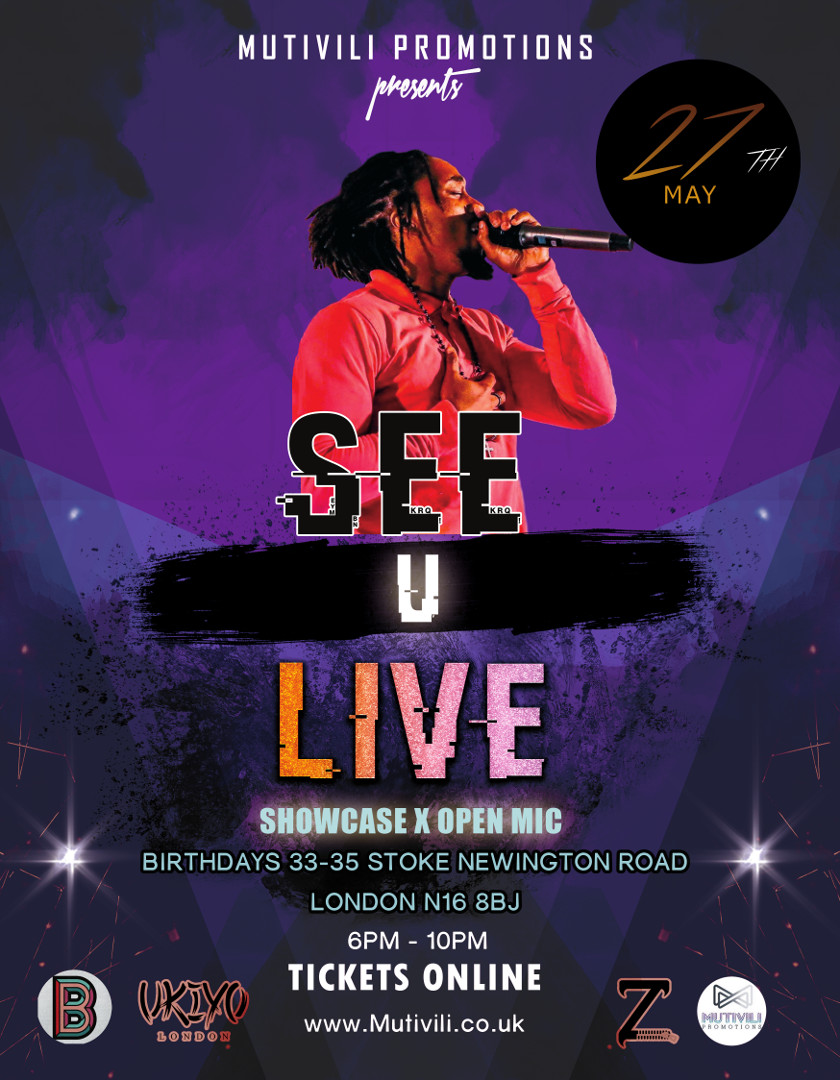 SEE U LIVE SHOWCASE IS BACK!!! We return to Birthdays Dalston this October with another superpowered lineup. Performances by: Juelz Dirty Daps Patrin Tee the Singer Justo Kenzo Dthrills ...